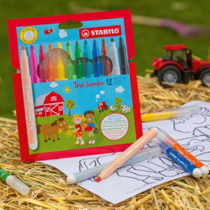 The extra-thick felt-tip pens STABILO Trio Jumbo in a cardboard wallet with 12 individual colors. You can find a list of color names and color numbers under Properties