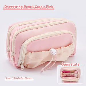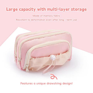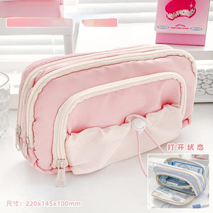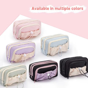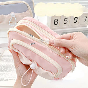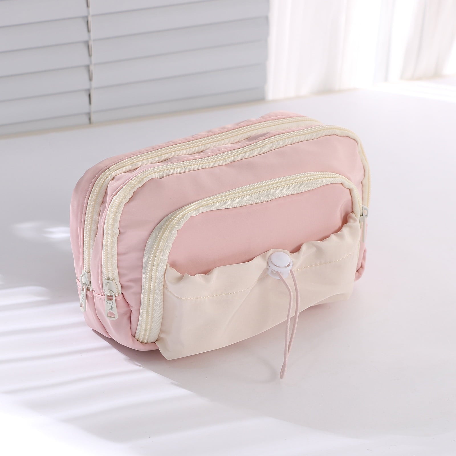 This pouch features three separate zip compartments, offering ample space to organize your essentials efficiently. Its large capacity design makes it ideal for storing cosmetics, stationery, or travel accessories, keeping items neatly separated and easily accessible. Crafted for durability and convenience, this pouch combines functionality with a stylish, subtle color suitable for everyday use.