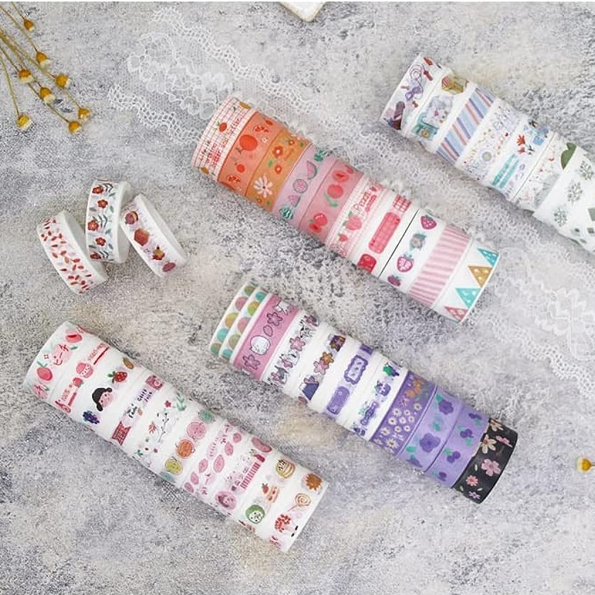This Fantasy Washi Tape Set includes sixty individual tapes with unique, vibrant designs. Each tape showcases a range of colors, patterns, and textures to meet all creative needs.
