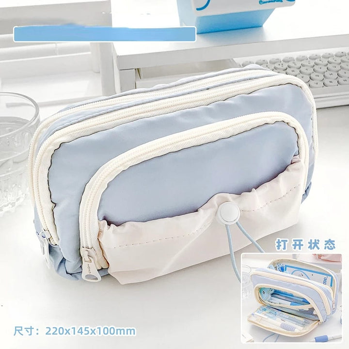 This pouch features three separate zip compartments, offering ample space to organize your essentials efficiently. Its large capacity design makes it ideal for storing cosmetics, stationery, or travel accessories, keeping items neatly separated and easily accessible. Crafted for durability and convenience, this pouch combines functionality with a stylish, subtle color suitable for everyday use.