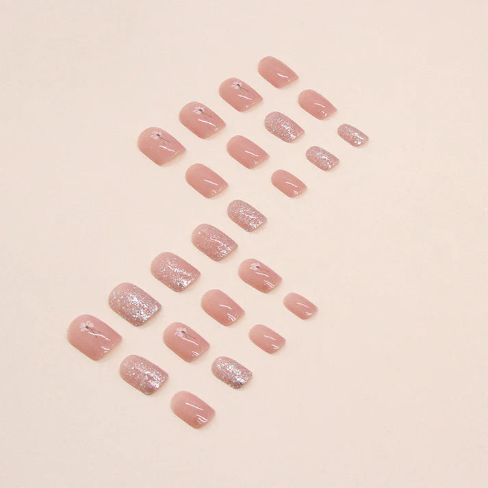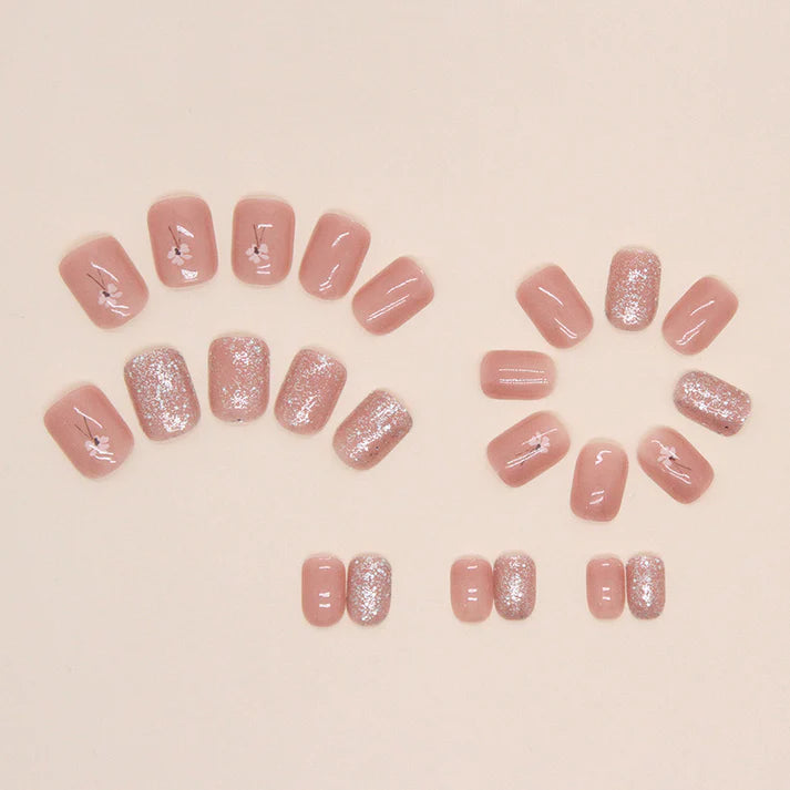 Glitter Pink & Flower - Press On Nail Set Of 24 + FREE Nail Application Kit