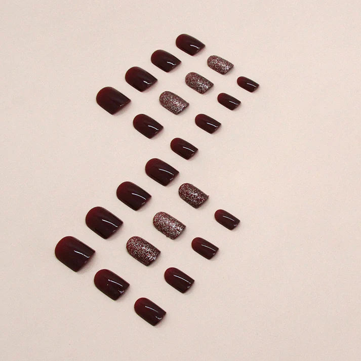 Glittery Maroon - Press On Nail Set Of 24 + FREE Nail Application Kit