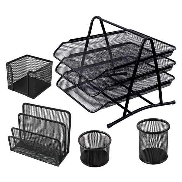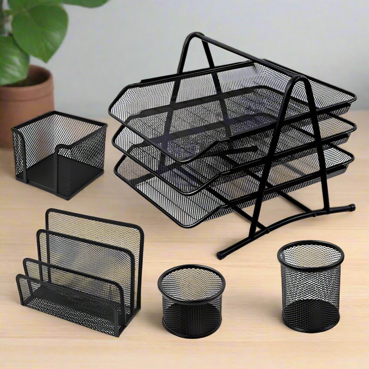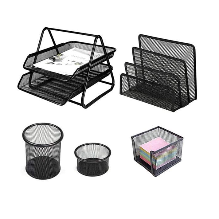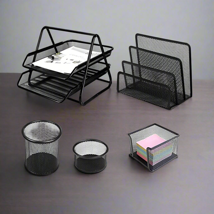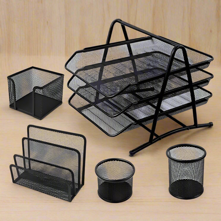 Increase your productivity with the Office Desk Organizer Kit Set of 5. This set includes a document tray, round pen holders, a card organizer, and a desk organizer. With this complete set, you can easily organize your desk and keep all your office essentials within reach. Stay organized and efficient with this must-have desk set.